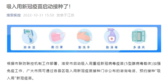 11月1日,康希诺生物股份公司在官方微信公众号宣布,继上海开启吸入用新冠疫苗接种后,江苏省十三个城市也已开展吸入用新冠疫苗的部署工作。