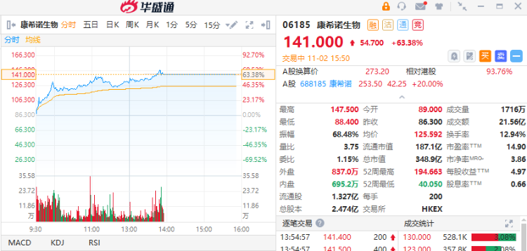 2日截至午间收盘,康希诺A股20%涨停,近7个交易日累计涨幅达96.36%。截至发稿,康希诺港股股价为141港元,涨幅超过63%,最近8个交易日累计涨幅已高达197%。