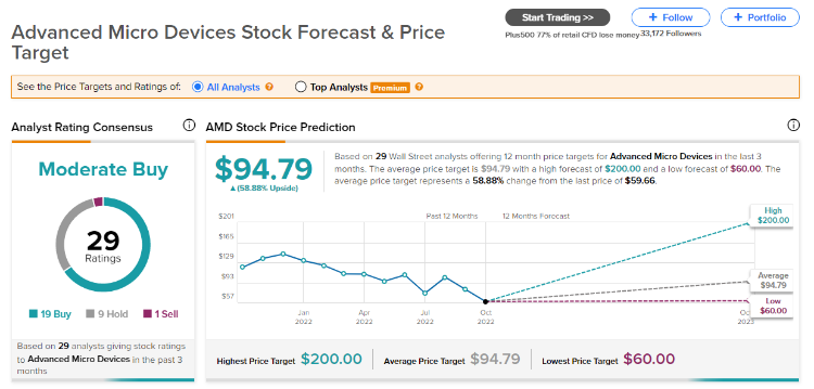 评级网站TipRanks数据显示,当前华尔街共有29位分析师的评级覆盖该股,其中包括19个“买入”评级、9个“持有”评级和1个“卖出”评级。华尔街分析师的平均目标价为94.79美元,较AMD最新收盘价约有58.88%的潜在上涨空间。