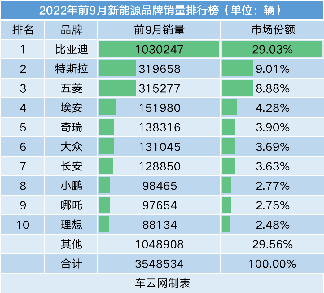 车云据上险数统计,前三季度前十品牌合力为新能源汽车市场贡献了超70%的市场份额,其中有7成品牌在截至第三季度结束的累计销量超过10万辆,比亚迪的贡献更是超过了100万辆,在所有新能源品牌中孤独求败。