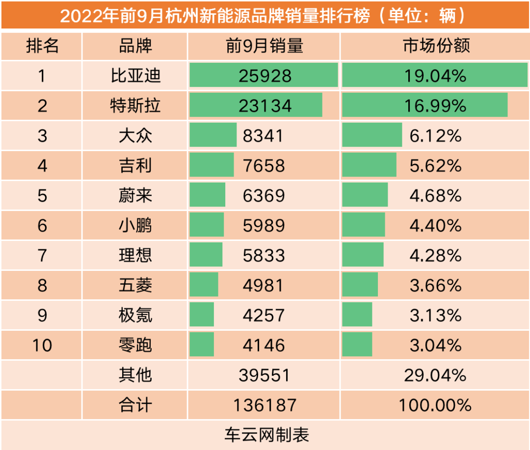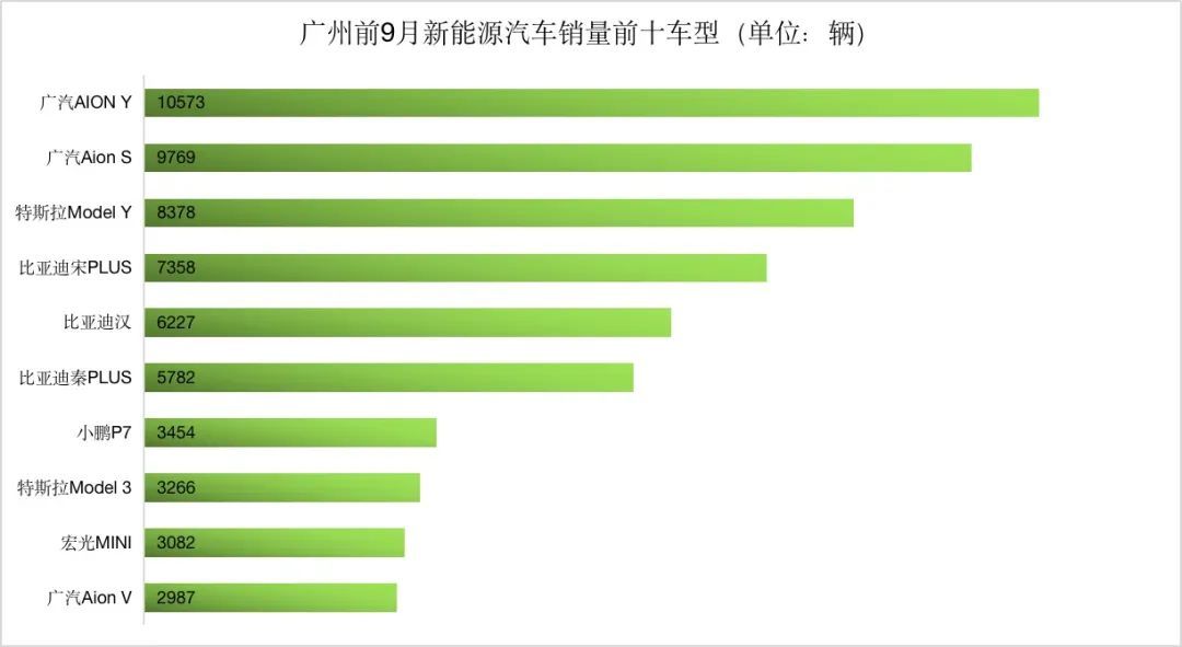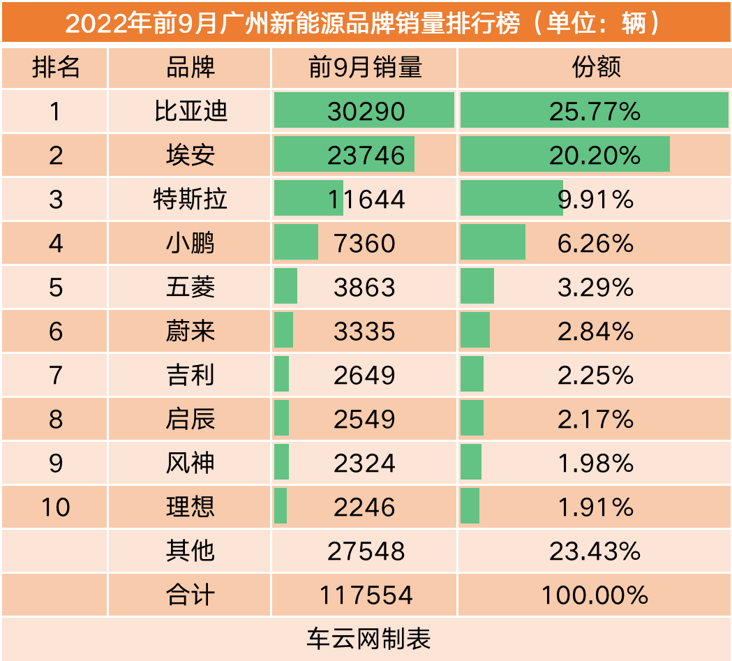 比亚迪依旧是广州新能源汽车市场的销量冠军,其前三季度在广州共录得3万辆销量,市场占有率高达25.77%。
