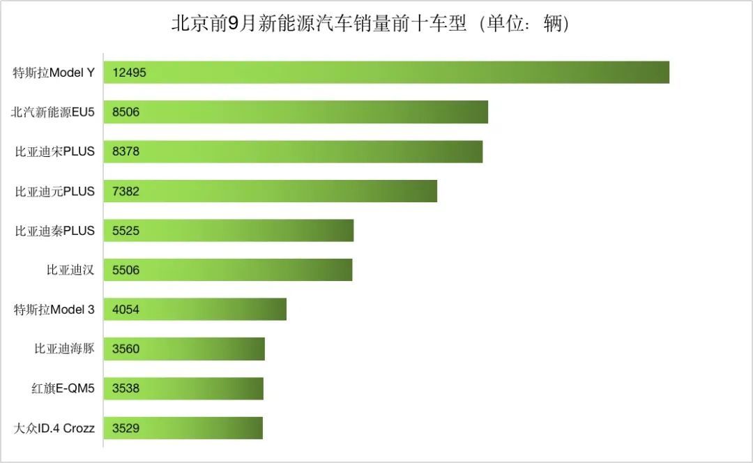 在北京,比亚迪又显示出了和深圳类似的巨大优势。前三季度,比亚迪在北京共取得了3.5万辆市场成绩,拿下了超过30%的市场份额,是排名第二特斯拉的2倍。