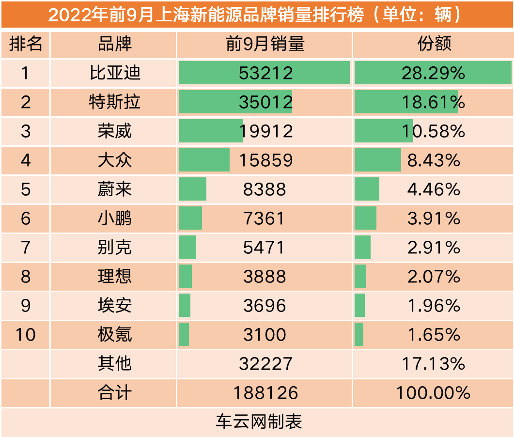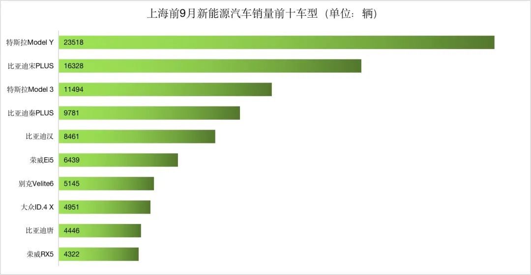 作为强势品牌,比亚迪和特斯拉在前三季度的上海市场包揽前二,其中比亚迪录得了5.3万辆销量,拿下了近30%的市场份额;特斯拉紧随其后取得了3.5万辆销量,市占率为18.61%。