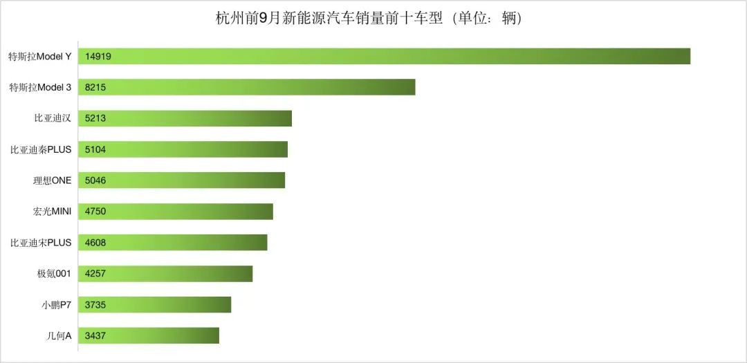 杭州也是特斯拉和比亚迪的差距最小的一个城市。前三季度,比亚迪依旧是杭州新能源汽车市场的销量冠军,占据了当地19.04%的市场份额。但特斯拉也不甘示弱,紧随其后拿下了16.99%的杭州份额。