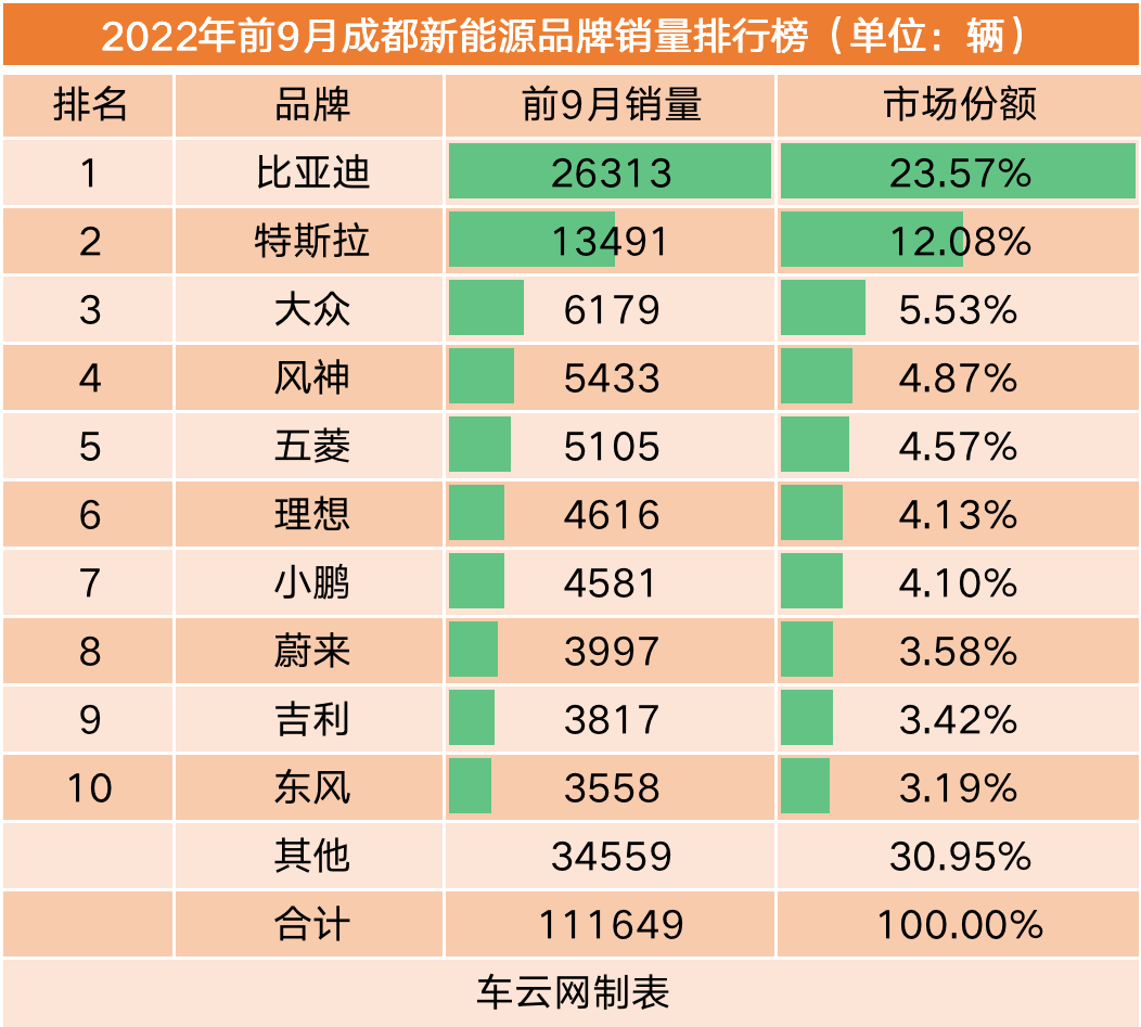 尽管如此,成都在前三季度依旧取得了11.2万辆的市场成绩,新能源汽车渗透率也超过30%达31.47%。