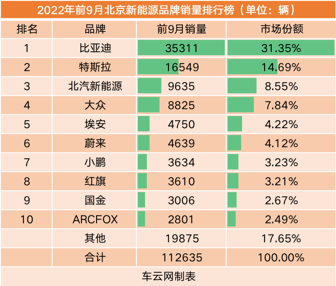 北京本地品牌也在北京收获了显著好于其它城市的市场成绩,北汽新能源和ARCFOX分列北京前三季度新能源汽车市场的第三和第十。