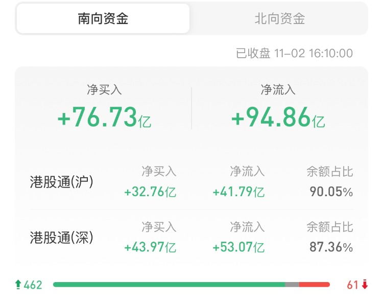 南下资金今日净买入港股76.73亿港元,其中港股通(沪)净买入32.76亿港元,港股通(深)净买入43.97亿港元。上一交易日净买入港股74.37亿港元。