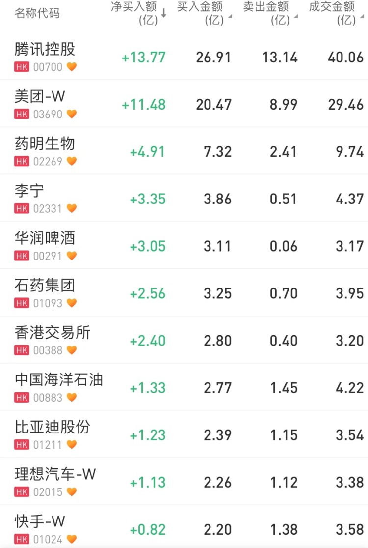 南下资金净买入腾讯控股 $00700.HK 13.77亿港元,净买入美团-W $03690.HK 11.48亿港元。此外,药明生物 $02269.HK 获净买入4.91亿港元,李宁 $02331.HK 获净买入3.35亿港元。
