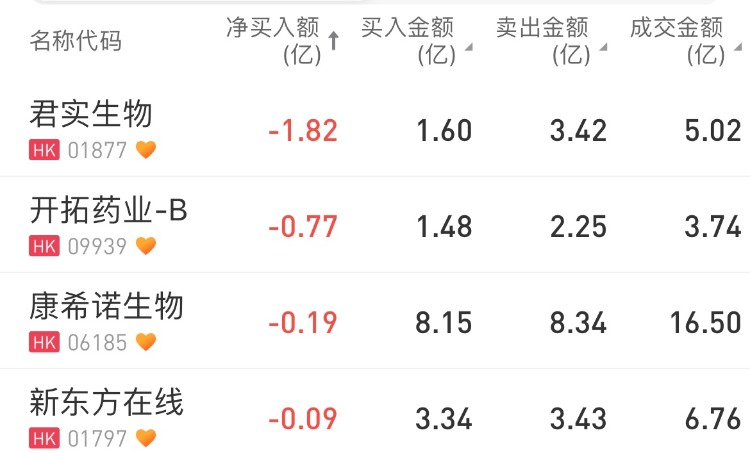 南下资金净卖出君实生物 $01877.HK 1.82亿港元,为今日卖出之最。净卖出开拓药业-B $09939.HK 0.77亿港元,净卖出康希诺生物 $06185.HK 0.19亿港元。