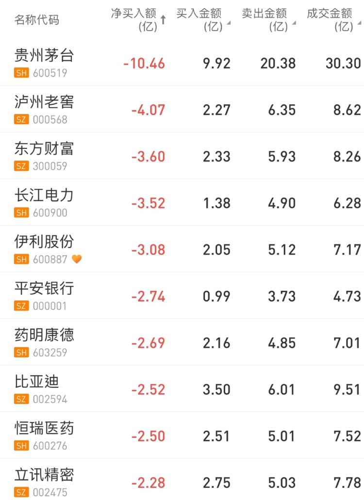 今日北上资金净卖出贵州茅台 $600519.SH 10.46亿元,泸州老窖 $000568.SZ 遭净卖出4.07亿元。