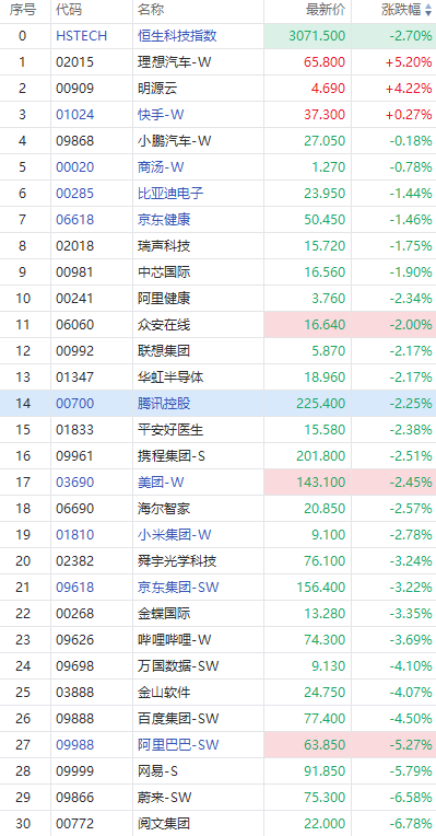 科网股多数走低,腾讯控股跌2.25%,美团跌2.45%,携程跌2.51%,小米集团跌2.78%,京东跌3.22%,网易跌5.79%,阿里巴巴跌5.27%,哔哩哔哩跌3.69%,百度跌2.11%,快手涨0.27%。