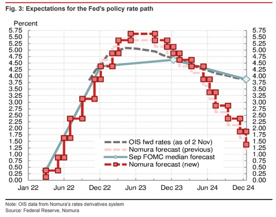 在美联储声明公布后,野村在最新研报中随后调整了对其加息节奏的预期,现在预计美联储12月加息50个基点(此前为75个基点),明年2月加息50个基点,3月加息50个基点(此前为25个基点),5月加息25个基点(此前没有做出预期)。因此,利率峰值将比野村之前的预测高出25个基点,上调至了5.50-5.75%。尽管美联储并未排除12月加息50个基点的可能性,但野村认为,此番鸽派言论范围仅限于12月会议上的加息幅度,其对总体前景的展望仍是鹰派的,似乎是有意将市场的焦点从关注加息步伐转移到更高的利率峰值。