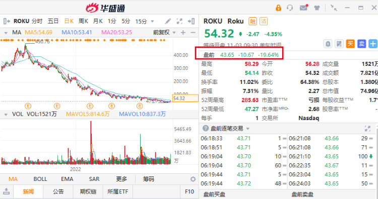 7、Roku盘前一度大跌超19%,四季度业绩指引不及预期