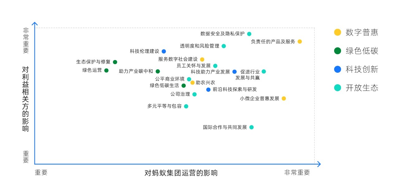 ESG的一大核心理念就是多利益相关方原则,蚂蚁集团的19项ESG议题中充分结合国家、社会、公众的重点关切,突出了碳中和碳达峰、乡村振兴、科技创新、普惠发展等关键议题。