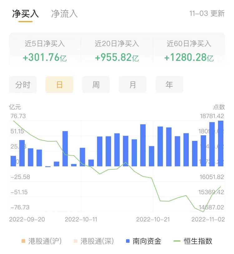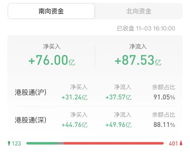 南下资金今日净买入港股76.00亿港元,其中港股通(沪)净买入31.24亿港元,港股通(深)净买入44.76亿港元。上一交易日净买入港股76.73亿港元。