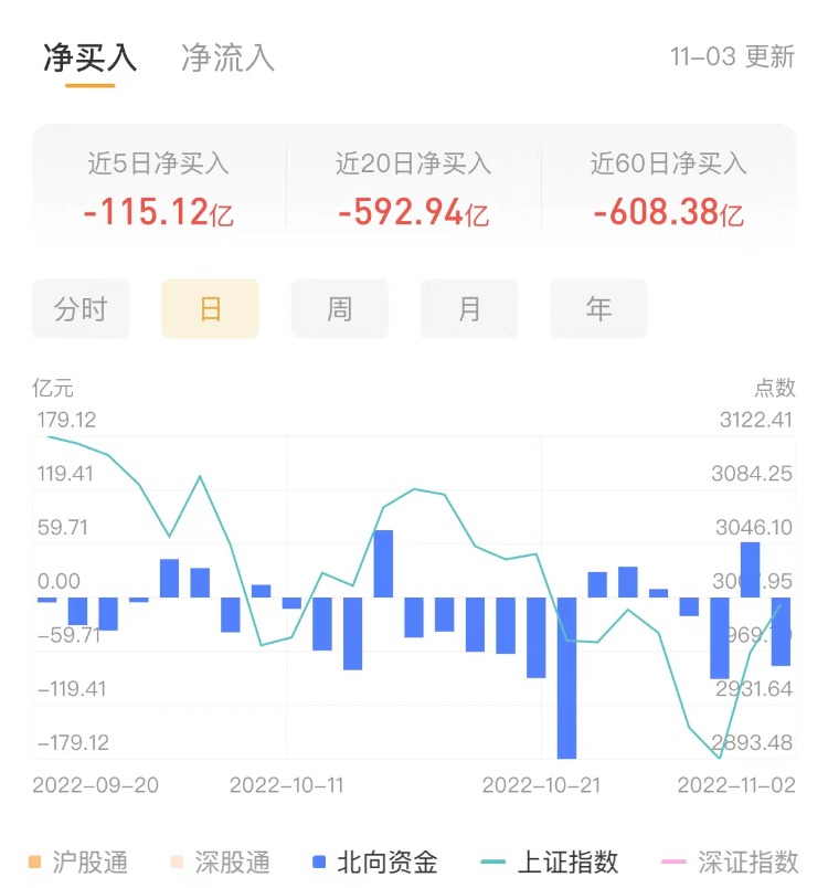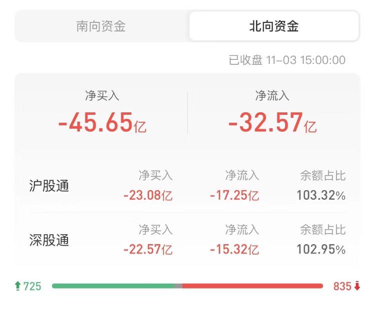 北上资金今日净卖出45.65亿元,沪股通净卖出23.08亿元,深股通净卖出22.57亿元。上一交易日净买入净卖出75.82亿元。