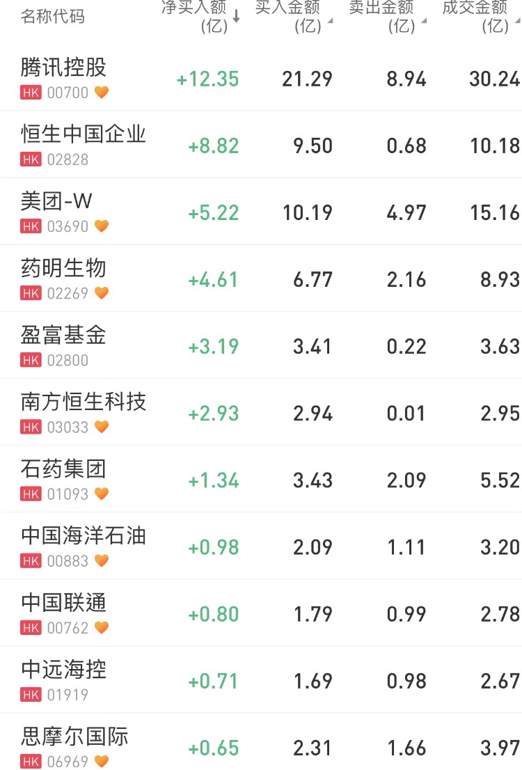 南下资金净买入腾讯控股 $00700.HK 12.35亿港元,净买入恒生中国企业 $02828.HK 8.82亿港元。此外,美团-W $03690.HK 5.22亿港元,药明生物 $02269.HK 获净买入4.61亿港元。