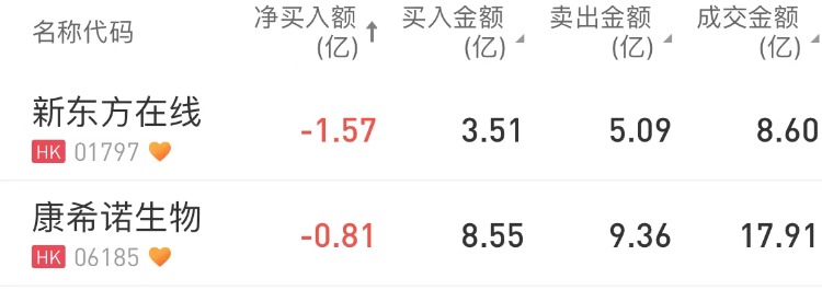 南下资金净卖出新东方在线 $01797.HK 1.57亿港元,为今日卖出之最。净卖出康希诺生物 $06185.HK 0.81亿港元。