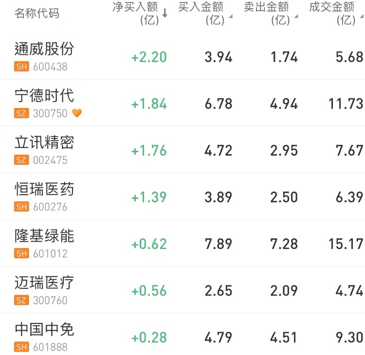 北上资金今日净买入通威股份 $600438.SH 2.2亿元,为今日买入之最;净买入宁德时代 $300750.SZ 1.84亿元。