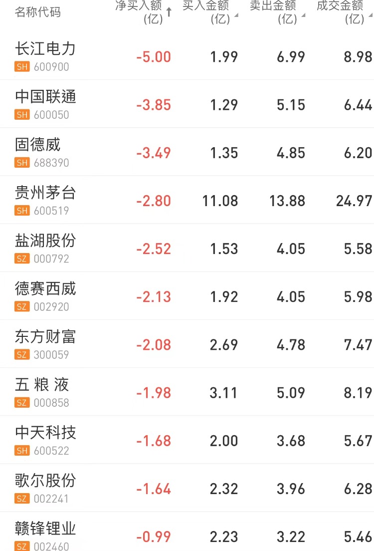 今日北上资金净卖出长江电力 $600900.SH 5亿元,中国联通 $600050.SH 遭净卖出3.85亿元。