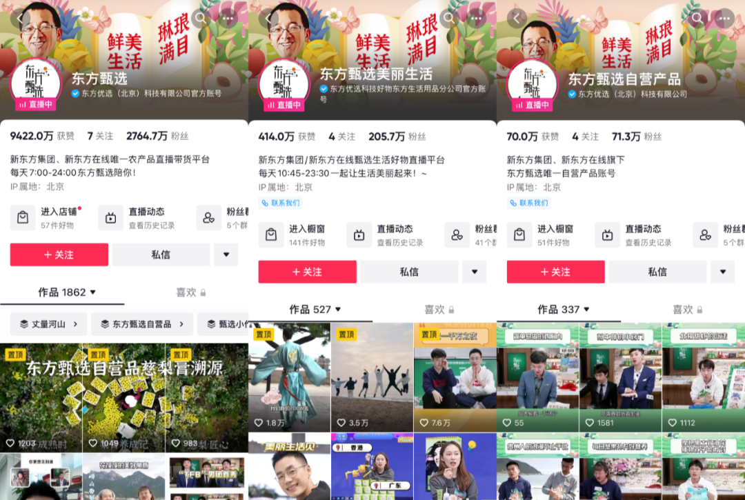 目前,东方甄选已经在抖音主账号的基础上,拓展除了东方甄选之图书、东方甄选美丽生活、东方甄选自营产品、东方甄选看世界和东方甄选将进酒等5个子账号。