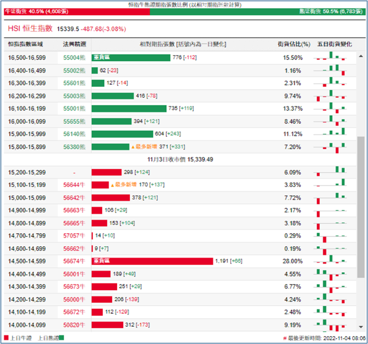 街货分布方面,至周五,恒指牛证街货重货区间主要在收回价14100点至14600点之间,累计相当约1949张期指合约;恒指熊证街货重货区主要在收回价16100点至16600点,累计相当约2116张期指合约。