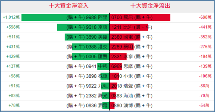 好仓(认购证及牛证)方面,周四阿里、京东、美团等相关好仓单日分别获得1012万港元、598万港元、511万港元资金净流入;腾讯、比迪、国电分别获得698万港元、441万港元、352万港元资金净流出。
