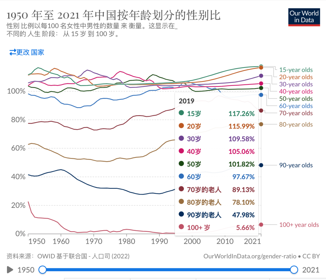 就用我国的数据来说,50 岁之前,男性人数都超过女性人数。