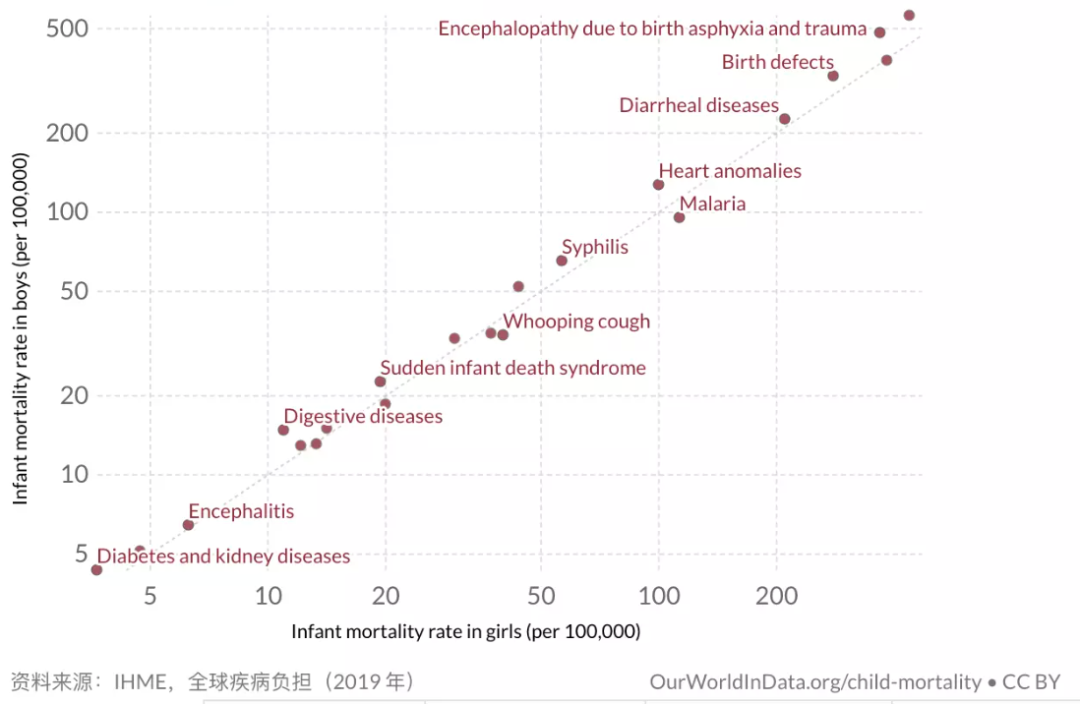 下图是全球男孩和女孩死亡率的对比,男孩的各种死亡风险几乎都在女孩之上: