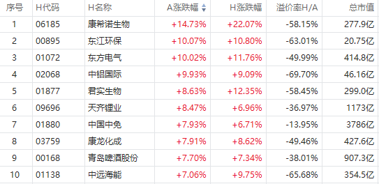 截至发稿,康希诺生物A股涨14.73%,港股涨22.07%;东江环保A股涨10.07%,港股涨10.08%;东方电气A股涨10.02%,港股涨11.76%。