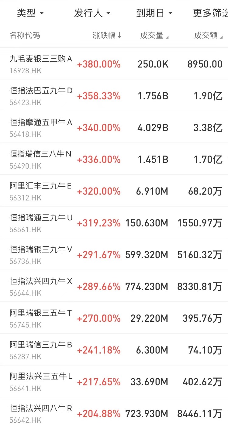 在今日涨幅榜中,恒指法巴五九牛D涨358.33%,恒指今日大涨5.36%,共有25只牛证涨超100%;阿里汇丰三九牛E涨320%。