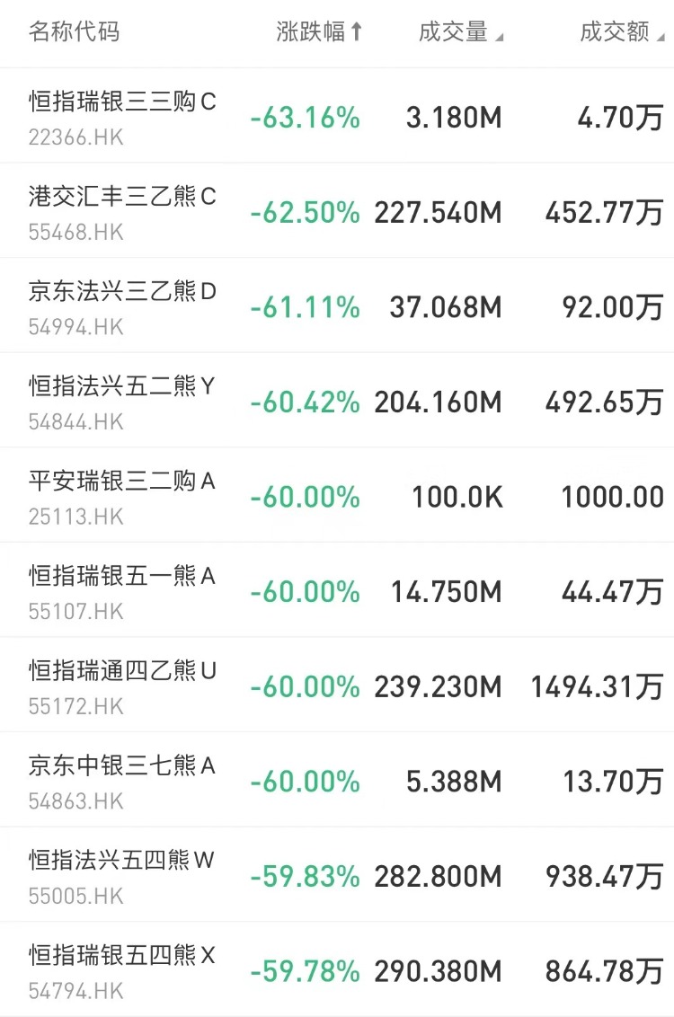 在今日跌幅榜中,港交汇丰三乙熊C跌62.50%,京东法兴三乙熊D跌61.11%。