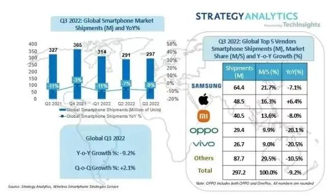 首先是Strategy Analytics的最新数据显示,2022年Q3全球智能手机出货量同比下降9%,为2.97亿部。这个数据可以说是自2014年以来数据最为糟糕的一个季度。