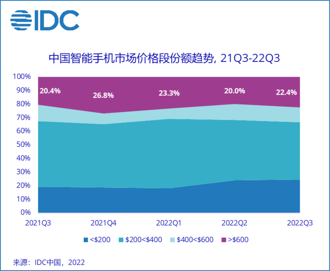 虽然整体市场持续低迷,但高端手机市场却呈现逆势增长态势。根据市场研究机构Counterpoint Research的报告,2022年三季度高端手机(600美元及以上)整体份额达22.4%,同比增长1.9个百分点,环比增长2.3个百分点。高端市场向来一枝独秀,这也是近些年来各大国产手机厂商不遗余力投身高端化突围的动力所在。
