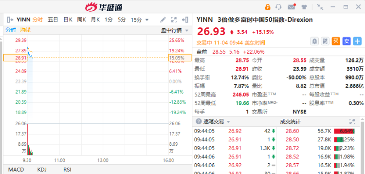 ETF方面,3倍做多富时中国50指数-Direxion一度大涨17%,现涨幅收窄至15.15%,报26.93美元,2倍做多沪深中国互联网指数ETF-Direxion涨超10.78%。