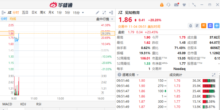 华盛资讯11月4日消息,美股盘中,中概股普涨,截止北京时间21:51,见知教育大涨28.28%,报1.86美元