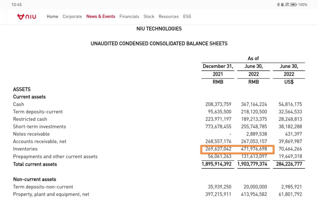 2022年二季报显示,截止到2022年6月30日这半年里,小牛电动的库存是4.72亿元左右,而年初这个数字差不多是在2.7亿元,增长近50%。一季报时库存是3.459亿元,二季度库存增加了1.26亿元,增加比例36.46%。与去年同期相比,库存增加超过123%。