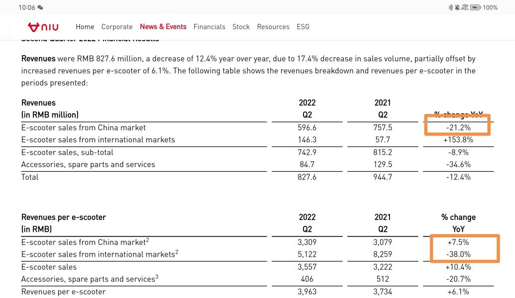 从最新二季报发布的数据中明确可看到,小牛电动在海外市场第二季度销售额增加了153.8%,但其单位售价却下降了38%。