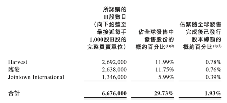 按发售价每股发售股份29.15港元计算,Harvest、临港及Jointown International已分别认购269.2万股发售股份、263.8万股发售股份及 134.6万股发售股份,共计667.6万股发售股份。