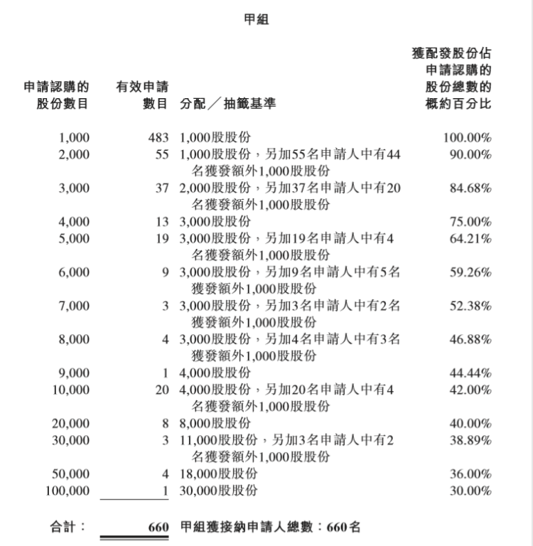香港公开发售项下初步提呈发售的香港发售股份已获略微超额认购。公司已接获合共668份根据香港公开发售通过网上白表服务及通过中央结算系统EIPO 服务提出认购合共474万股香港发售股份的有效申请,相当于香港公开发售项下初步可供认购的224.6万股香港发售股份总数的约2.11倍。