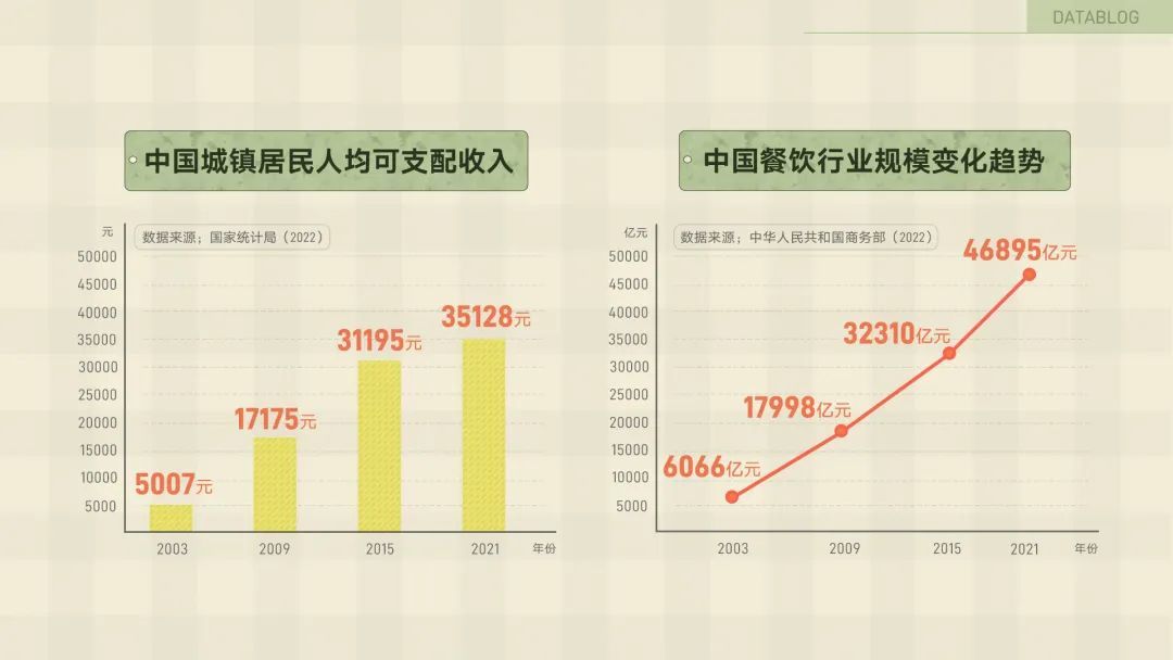 但距离自助餐行业兴起的 2003 年到现在,中国城镇居民人均可支配收入翻了 6 倍 [12],中国餐饮行业规模翻了 6.7 倍 [13],现在和朋友约饭,很多人优先考虑的因素,变成了“谁家更好吃”。