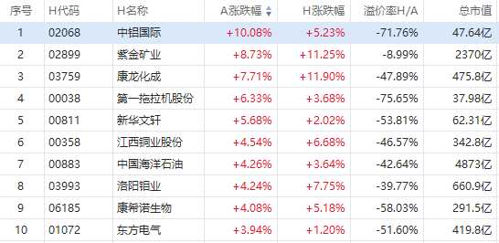 截至发稿,中铝国际A股涨停,港股涨5.23%;紫金矿业A股涨8.73%,港股涨11.25%;康龙化成A股涨7.71%,港股涨11.9%。