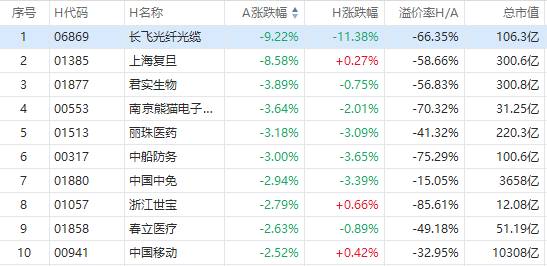 长飞光纤A股跌9.22%,港股跌11.38%;君实生物A股跌3.89%,港股跌0.75%;南京熊猫电子A股跌3.64%,港股跌2.01%。