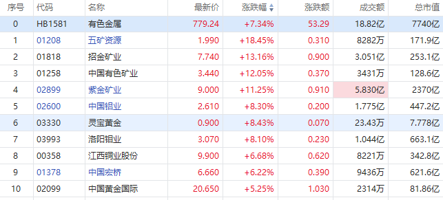 港股有色金属板块涨幅居前,五矿资源涨超18%,招金矿业涨超13%,紫金矿业涨超111%,中国有色矿业、中国黄金国际涨逾5%。
