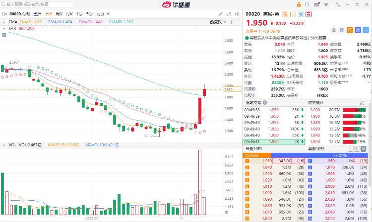 华盛资讯11月8日消息,港股商汤-W今日涨势持续扩大,盘中升超13%;周内涨超45%;截至发稿,股价涨8.33%,报1.95港元每股,当前成交额超4亿港元。