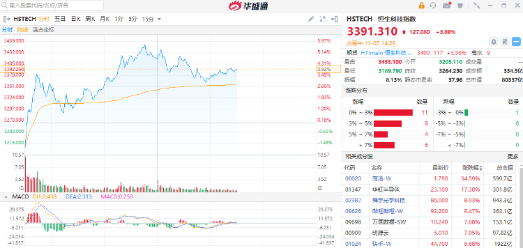 今日,港股低开高走,截至发稿,恒指涨超4%,大涨650点报16811点,恒生科技指数飙涨5.6%报3448点,国指涨4.1%,盘面上,科网股、地产及大金融板块领涨。