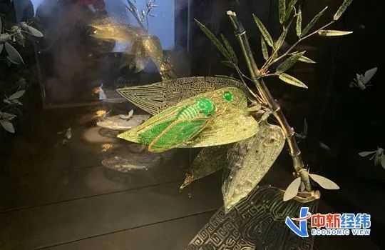 据介绍,《悟禅知翠》中,蝉抱一颗帝王翡翠,背面镶一颗温润的紫罗兰翠玉。蝉身的翡翠圆珠,皆采以“内格榫卯嵌接法”镶嵌。极薄的翅膀运用了陈世英2002年发明的“翡翠切割润光专利技术”。