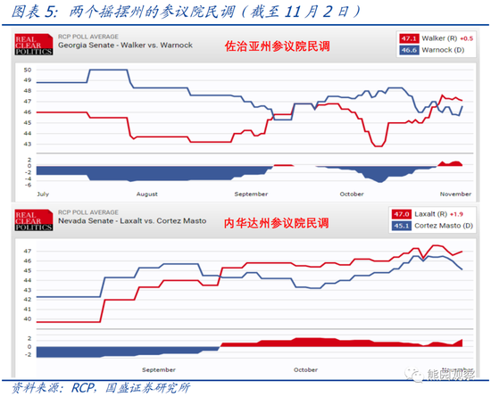 >参议院:270towin共识预测显示,民主党和共和党均有望获得49个席位,另有2个摇摆席位,分别为佐治亚州和内华达州。这2个席位的现任参议员均为民主党人,而共和党挑战者Walker和Laxalt均获得了特朗普背书,民调显示目前共和党在这两个席位均以不到2%的微弱优势领先。Predictit数据显示,民主党继续控制参议院的概率约为30%,共和党控制众议院的概率约为70%。