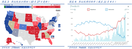 对美国中期选举结果的预测可以通过两种方法:一是270towin的共识预测,综合了7家权威政治媒体的民调数据和专家意见;二是Predictit的博彩赔率,反映的是投资者对选举结果的交易情况。截至11月5日,二者最新结果如下:>众议院:270towin共识预测显示,民主党有望获得200个席位,共和党有望获得223个席位,另有12个摇摆席位,共和党已能获得半数席位。Predictit数据显示,民主党继续控制众议院的概率约为10%,共和党控制众议院的概率约为90%。