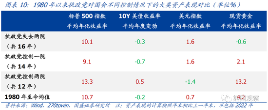 >中长期视角:1980年至今,执政党失去两院、控制一院、控制两院的情况分别有十六年、十四年、十二年。从图表10可以看出,美股在执政党控制两院时表现最好;10Y美债收益率在执政党控制两院时表现为上行,其他情况下均表现为下行;美元指数在执政党控制两院时表现为下跌,其他情况下均表现为上涨;黄金在执政党控制两院时平均涨幅最大。原因可能在于,一旦执政党控制国会两院,往往会推出扩张性政策,提振经济的同时也会导致财政赤字扩大,从而利好美股和黄金,利空美债和美元。
